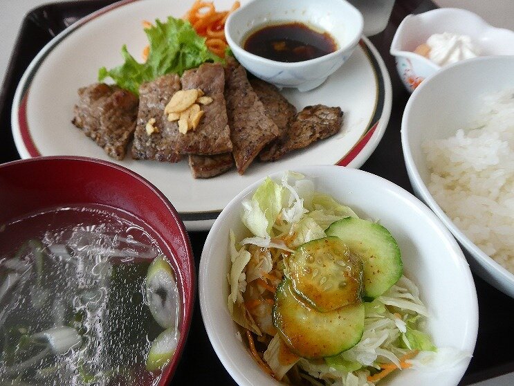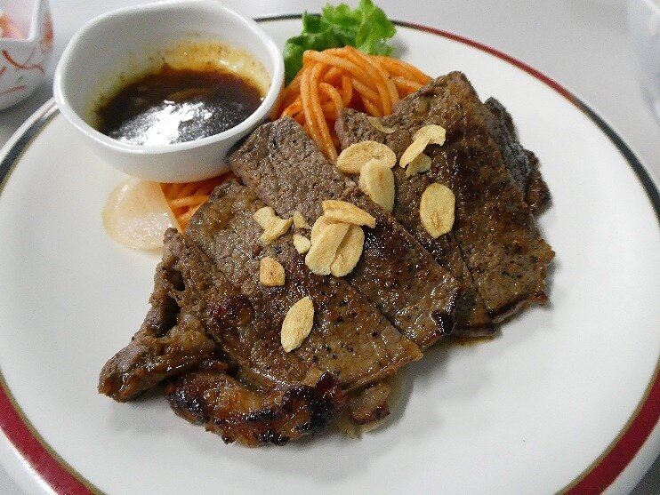- 1番の目玉の牛肉ステーキ定食。上に乗ったニンニクチップスがお肉を引き立てる。