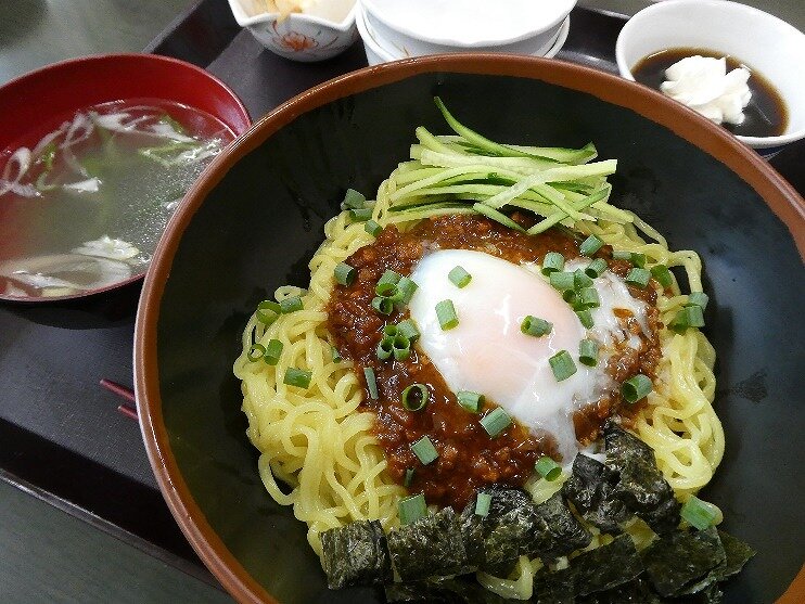- ジャージャー麺は日替わりで醤油味と味噌味を用意。つけ合わせのコーヒーゼリーがこれまた美味しい!