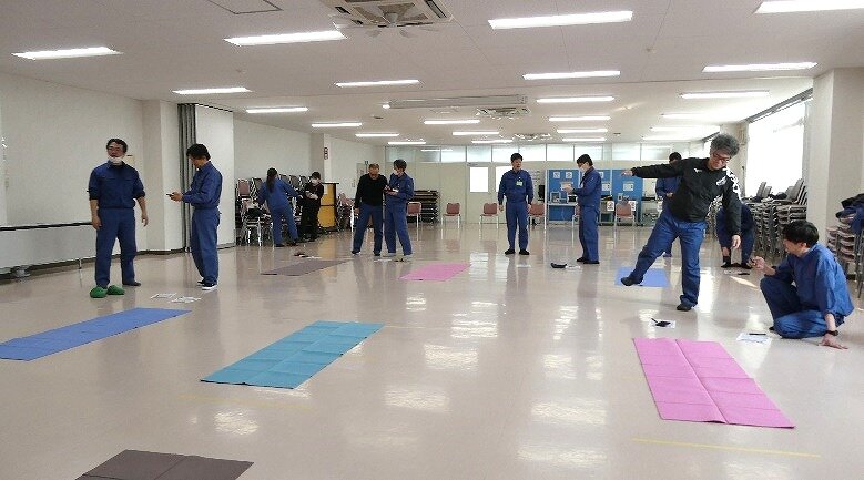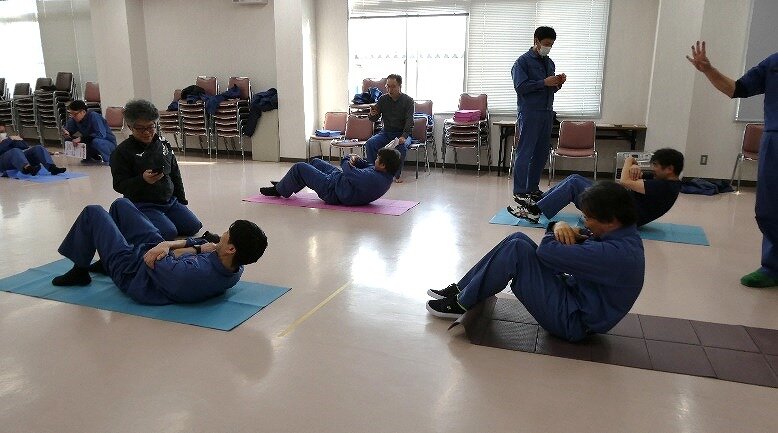 社内で体力チェックを行っています。みんなで和気あいあいと楽しく実施。久しぶりにやった腹筋ではお腹が割れそうです。 ※張り切りすぎによるケガにはご注意を!