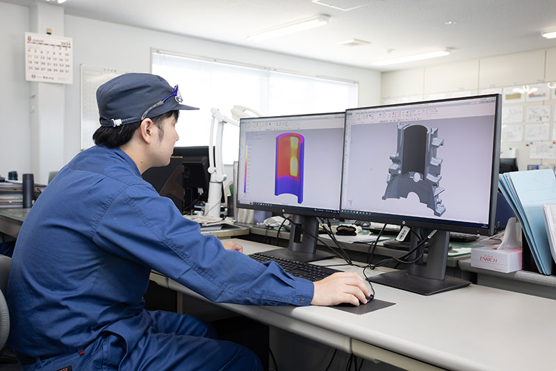 長年の経験と実績から培ってきた技術に加え、コンピュータを活用した解析技術により商品開発の高度化に取り組んでいます。CAE解析により、製品デザイン・生産技術の性能および特性や妥当性などを事前に検証することが可能となります。