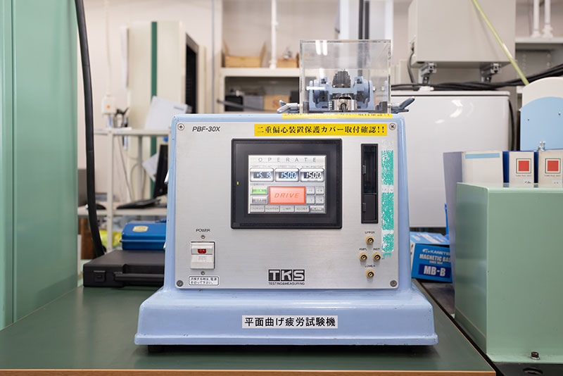 材料の疲労強度を評価する装置。主に平面曲げ疲労試験にて、材料評価を行っています。